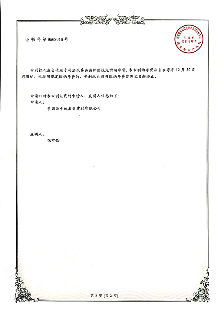 專利證書(一種石膏板側(cè)壁紙面粘結(jié)裝置)